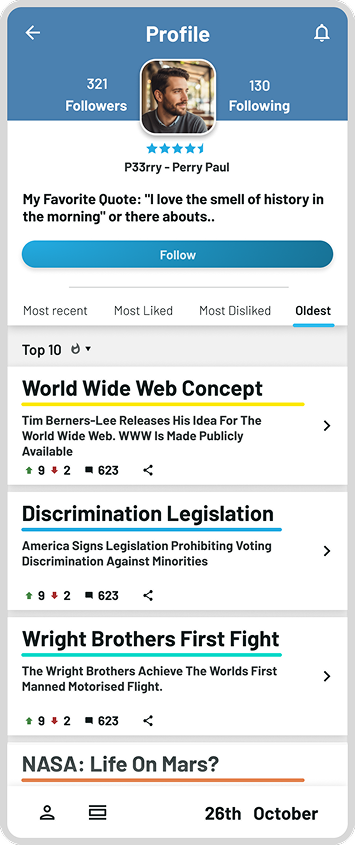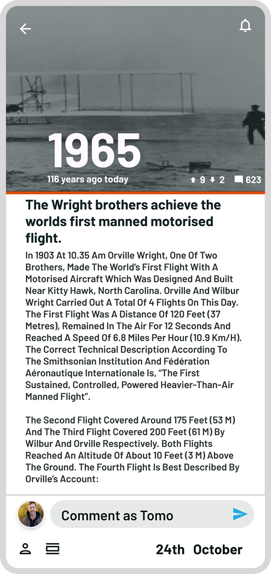 Tests were conducted to determine whether the title should reflect the number of years since the event occurred, the actual year of the event, or use an 'in' prefix with the year. This approach emphasized the date over the event but restricted the compatibility of the description and title. Consequently, I decided to display the date elsewhere on the screen in later designs, retaining only the title and description.