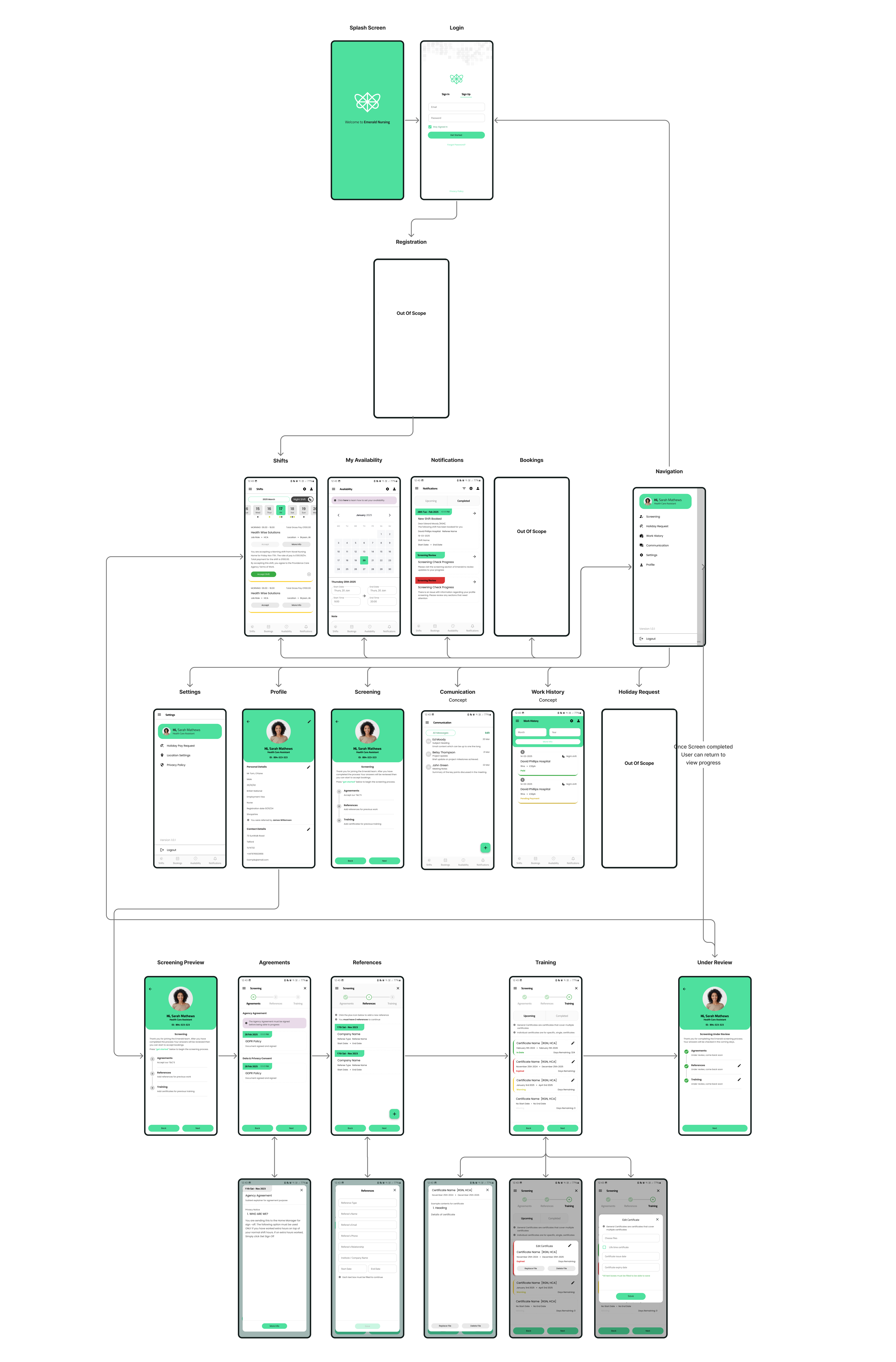 This flow highlights the screening process, which begins after registration on the web system. Originally, the homepage provided access to Settings, Shifts, Profile, Notifications, My Availability, Bookings, Timesheet, and Documents through buttons on both the homepage and nav bar.