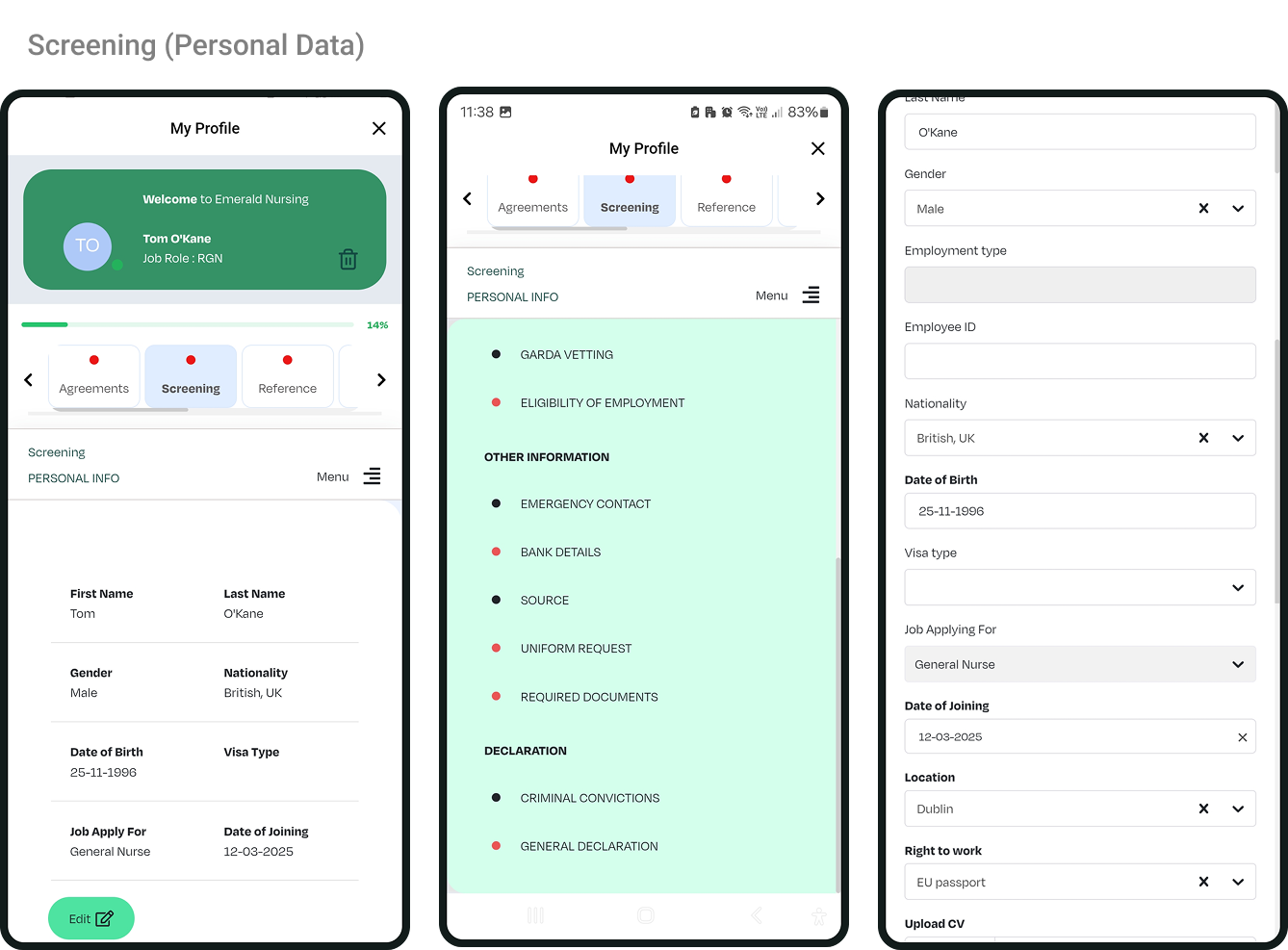 The screening process is an essential extension of the registration process, playing a vital role in onboarding future nurses. By refining the pre-registration questionnaire, registration, and screening process, the application aims to minimize onboarding drop-offs, streamline platform interfaces, and eliminate unnecessary elements such as chat and work history.
