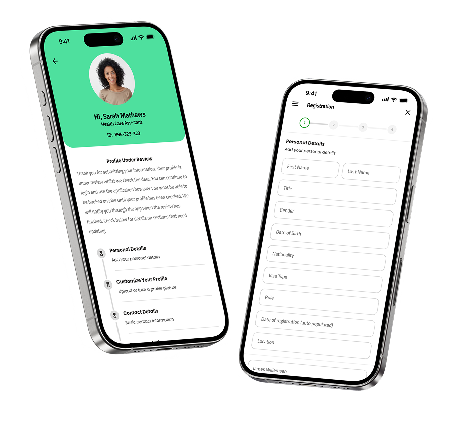 We started with a lengthy screening process that included several flows; Agreements, “Screening” for personal details, References, Training, Communications, staff referral, Work history. Additionally, there was an absence of a mobile registration process, and multiple instances of duplicate data entry were present across web registration, pre-registration screening, and profile setup.