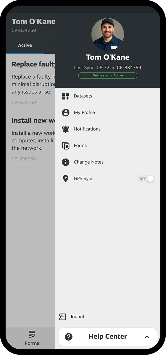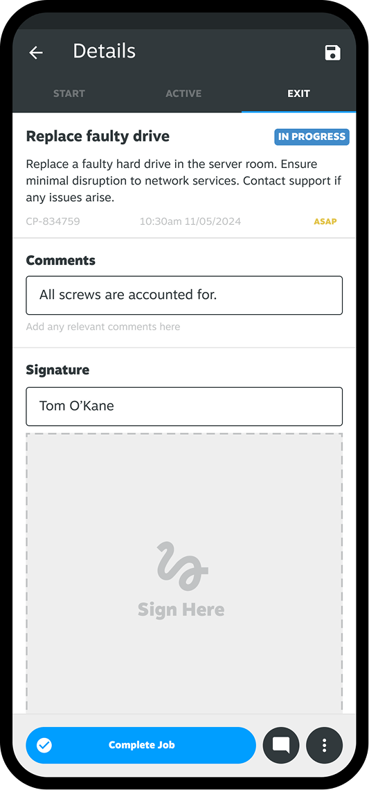 The Start, Active, and Exit tabs guide users through the necessary data at each job stage. This approach divides job requirements into manageable pages, providing relevant information to assist users effectively. For instance, a user in the Exit stage would benefit more from a 'sign off' section than a 'pre-worker inspection' card.